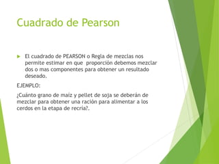 Este documento describe dos métodos para balancear raciones alimenticias para cerdos: el cuadrado de Pearson y las ecuaciones simultáneas. El cuadrado de Pearson utiliza proporciones para determinar la mezcla correcta de alimentos para lograr el contenido proteico deseado. Las ecuaciones simultáneas emplean álgebra para plantear un sistema de ecuaciones que representa los alimentos y nutrientes, cuya solución indica la composición de la ración balanceada.