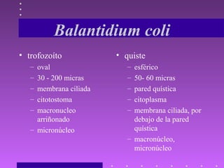 El documento describe Balantidium coli, un parásito que causa balantidiasis. Se transmite a través de la ingestión de quistes en heces contaminadas, especialmente de cerdos. Los síntomas incluyen diarrea con moco y sangre. El diagnóstico se realiza a través de exámenes parasitológicos de heces y el tratamiento es con metronidazol u otros antimicrobianos. Se recomienda un control individual a través del diagnóstico y tratamiento oportunos, así como medidas de higiene después de contacto con cer