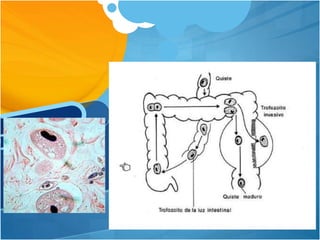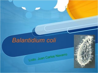 Balantidium coli es un protozoo parásito grande que infecta el intestino grueso humano. Tiene dos estadios de vida, el quiste infectante y el trofozoito activo. El trofozoito es de forma ovalada y cubierto de cilios, con un macronúcleo en forma de riñón y dos vacuolas contráctiles. Puede causar disentería, deposiciones con sangre y pus, y otros síntomas gastrointestinales. Se transmite a través del agua o alimentos contaminados, y los cerdos son el principal reservorio.