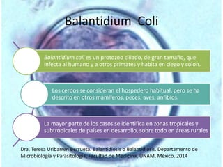 Balantidium coli es un protozoo ciliado que infecta el intestino grueso del humano y otros animales. Se transmite principalmente a través del contacto con cerdos infectados o agua contaminada. Los síntomas incluyen diarrea, dolor abdominal y pérdida de peso. El diagnóstico se realiza a través del examen microscópico de las heces y el tratamiento más efectivo es el metronidazol.
