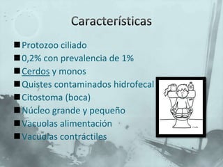 Balantidium coli es un protozoo ciliado que puede infectar cerdos y monos y causar enfermedades en humanos a través de la ingestión de quistes contaminados. Los síntomas incluyen disentería, abscesos hepáticos y pulmonares, y peritonitis. El diagnóstico se realiza identificando los trofozoitos ciliados o quistes en muestras fecales, y el tratamiento incluye medicamentos como la metronidazol.