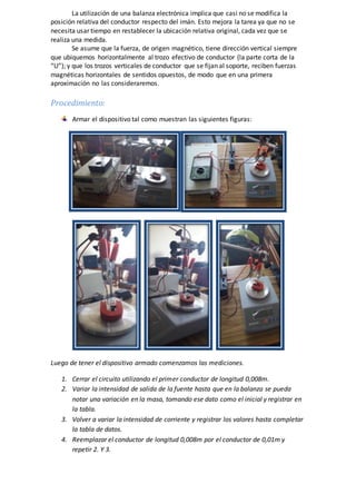 El documento describe un experimento utilizando una balanza de campo magnético para verificar la relación entre la fuerza magnética y la intensidad de corriente en un conductor inmerso en un campo magnético. Se observó que la fuerza magnética es proporcional a la intensidad de corriente, y se proporcionaron datos y gráficas que respaldan esta relación. Se concluyó que el módulo del campo magnético depende de la longitud del conductor utilizado en el experimento.