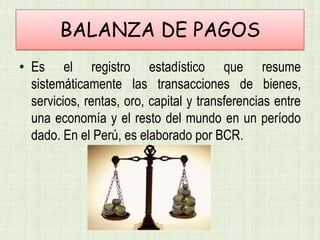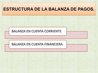 La balanza de pagos resume las transacciones económicas entre un país y el resto del mundo en un período, registrando la cuenta corriente de bienes, servicios y transferencias, así como la cuenta financiera de capitales a largo y corto plazo. Se divide en balanza comercial, de servicios, de renta de factores y transferencias corrientes en la cuenta corriente, e inversión y préstamos en la cuenta financiera.