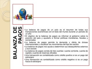 Este documento explica los conceptos clave de la balanza de pagos de un país. La balanza de pagos consta de tres cuentas: la cuenta corriente, la cuenta de capital y la cuenta de reservas oficiales. La cuenta corriente incluye el comercio de bienes y servicios y las transferencias unilaterales. Un superávit o déficit en la cuenta corriente indica si un país gasta más o menos de lo que produce.