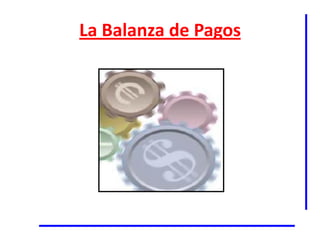 La Balanza de Pagos es un registro de las transacciones económicas entre residentes y no residentes de un país. Se compone de la Cuenta Corriente, que incluye transacciones de bienes, servicios, renta e ingresos, y la Cuenta de Capital y Financiera, que incluye flujos de capital e inversiones. Un déficit o superávit en la balanza de pagos depende de si hay más pagos al exterior o ingresos del exterior. La balanza de pagos de Colombia ha mostrado déficit en cuenta corriente pero superávit en cuenta de capital y financ