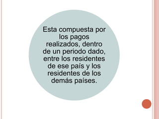 La balanza de pagos resume las transacciones financieras entre un país y el resto del mundo durante un período determinado, incluyendo pagos realizados y recibidos por residentes. Se compone de créditos por pagos recibidos de no residentes y débitos por pagos realizados a no residentes. Abarca solo transacciones en efectivo o que implican compra o venta de divisas, como el envío de bienes de organizaciones de caridad al exterior que se clasifica como un crédito.