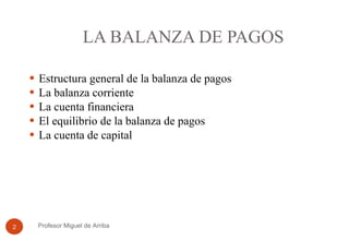 La balanza de pagos es un documento contable que registra sistemáticamente todas las transacciones entre residentes y no residentes en un período. Se compone principalmente de la cuenta corriente, que incluye el comercio de bienes y servicios así como las rentas e inversiones, y la cuenta financiera, que registra los flujos de capital y activos financieros. La suma de todas las cuentas debe ser cero para mantener el equilibrio de la balanza de pagos.