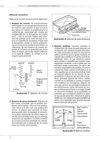 El documento detalla el funcionamiento y diferentes tipos de balanzas, explicando su propósito principal de medir la masa y el peso de objetos basándose en la gravedad. Se diferencian entre balanzas mecánicas y electrónicas, cada una con sus principios de operación y aplicaciones en laboratorios. También se discuten aspectos técnicos como calibración, mantenimiento y consideraciones para su correcta instalación.