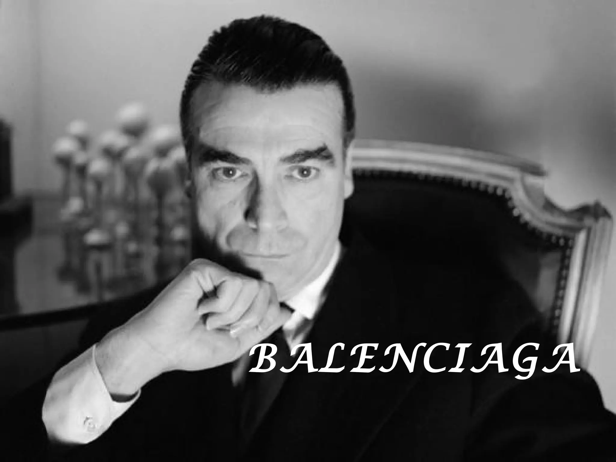 Cristóbal Balenciaga fue un diseñador de moda español considerado uno de los más influyentes del siglo XX. Nació en 1895 en España y se dedicó a la moda desde una edad temprana, abriendo su primera casa de costura en 1918. Balenciaga revolucionó el diseño de vestidos mediante el uso innovador de volúmenes, cortes y tejidos. A pesar de competidores como Christian Dior, mantuvo su prestigio gracias a su maestría técnica y estilo elegante pero funcional, atrayendo a clientas de
