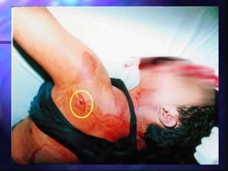 Este documento describe las lesiones por armas de fuego y la balística. Explica qué son las armas de fuego, su clasificación y componentes. Describe el estudio de la balística interna, externa e impacto. Explica los diferentes tipos de proyectiles, balas y sus características. Finalmente, analiza las lesiones por impacto de bala y cómo se pueden estudiar la trayectoria, orificios de entrada y salida.