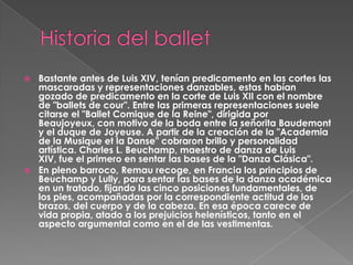 El documento resume la historia del ballet desde sus orígenes en la corte francesa hasta su evolución en los siglos XIX y XX. Comienza describiendo el desarrollo del ballet en Francia bajo Luis XIV y la creación de la Academia de la Música y la Danza. Luego describe las innovaciones de coreógrafos como Noverre, Taglioni y Petipa que llevaron al ballet romántico y las adaptaciones del ballet clásico en Rusia. Finalmente, resume los desarrollos del ballet moderno y contemporáneo en el