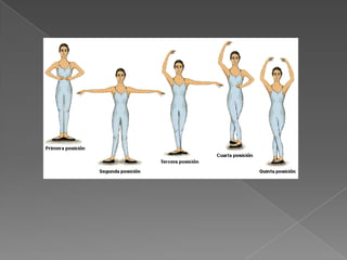 El documento habla sobre los métodos y técnicas del ballet clásico. Explica que se enseña a través de cinco posiciones básicas de los pies y movimientos de todo el cuerpo. También menciona que el vestuario debe ser cómodo y ajustado para poder corregir la postura y formas, y que el uso de puntas requiere experiencia y fuerza para evitar lesiones.
