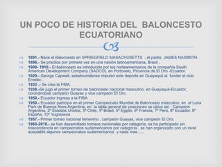 El básquetbol fue inventado en 1891 por James Naismith en Massachusetts. Llegó a Ecuador en 1900-1910 a través de compañías estadounidenses y se popularizó en la década de 1930 con la creación de ligas. Ecuador participó en el primer Campeonato Mundial en 1950 en Buenos Aires. Pablo Sandiford fue una gloria del baloncesto ecuatoriano jugando 11 sudamericanos para la selección entre las décadas de 1940 y 1960.
