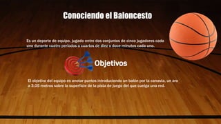 El baloncesto es un deporte de equipo que se juega entre dos equipos de cinco jugadores. Cada equipo intenta anotar más puntos que el contrario encestando el balón a través de canastas de uno, dos o tres puntos. Se gana el partido anotando la mayor cantidad de puntos en cuatro períodos de 10 a 12 minutos cada uno.