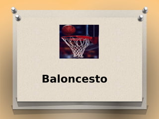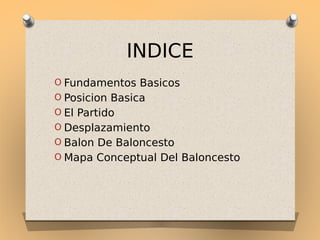 El documento proporciona información sobre varios aspectos fundamentales del baloncesto, incluyendo diferentes tipos de pases, dribbling, lanzamientos, y la posición básica defensiva. También describe brevemente las reglas básicas de un partido de baloncesto, incluyendo cómo comienza el juego, cómo se anota, y cómo termina. Además, cubre los diferentes tipos de desplazamientos ofensivos y las especificaciones de los balones de baloncesto aprobados por la FIBA para diferentes categorías.