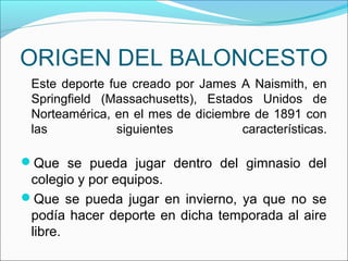 El baloncesto fue creado por James Naismith en 1891 para que se pudiera jugar en invierno dentro de gimnasios. Se juega en una cancha rectangular con cestas a cada extremo. Cada equipo tiene 10 jugadores que intentan anotar lanzando el balón a través de la red de la cesta contraria usando pases, dribbling y lanzamientos.