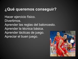 Este documento presenta un plan de cuatro sesiones para enseñar baloncesto a estudiantes de 6o grado de primaria. El objetivo es que los estudiantes hagan ejercicio, se diviertan, aprendan las reglas y las habilidades básicas del baloncesto como el bote, los pases y los lanzamientos a canasta. Cada sesión se centra en una técnica diferente, como el control del balón, los desplazamientos, los lanzamientos y la coordinación de saltos con lanzamientos.