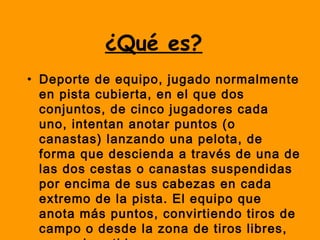 El documento proporciona una introducción al baloncesto, incluyendo una descripción del juego, su historia, las reglas y componentes básicos como el territorio de juego, las posiciones, las faltas y tiros libres, las técnicas de ataque y defensa. El baloncesto es un deporte de equipo que se juega en una cancha rectangular con dos canastas a cada extremo, y el objetivo es anotar más puntos que el equipo contrario lanzando una pelota a través de la canasta.