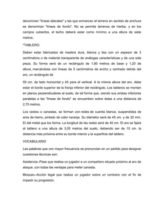 El documento proporciona información sobre las reglas y orígenes del baloncesto. Fue inventado en 1891 por James Naismith para practicarse en interiores durante el invierno. Consiste en introducir una pelota esférica en un cesto de altura reglamentaria mientras se impide que el equipo contrario anote. Los partidos se dividen en dos tiempos de 20 minutos y existen reglas técnicas sobre el tamaño de la cancha, pelota y cesto.