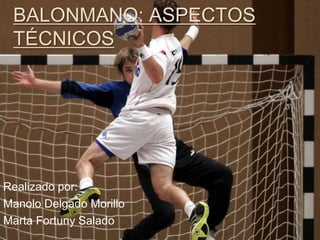 Este documento describe los aspectos técnicos fundamentales del balonmano, incluyendo la adaptación del balón, los pases, la recepción del balón, el ciclo de pasos, los lanzamientos y las fintas. Explica cómo sostener correctamente el balón y los diferentes tipos de pases, recepciones, lanzamientos y fintas, además de describir el ciclo de pasos y los límites de tiempo para pasar el balón.