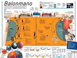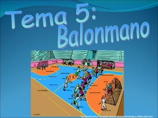 El documento resume la historia, reglas y técnicas básicas del balonmano. Explica que surgió en la antigua Grecia y se desarrolló en la época romana, tomando su forma actual en el siglo XIX en Europa. Detalla las reglas sobre el terreno de juego, duración, número de jugadores, así como técnicas individuales como el manejo del balón, el bote, el pase y el lanzamiento. También habla sobre los principios tácticos de ataque y defensa en balonmano.