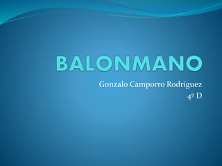 Este documento resume las reglas básicas del balonmano, incluyendo detalles sobre el terreno de juego, duración de los partidos, posiciones de los jugadores, tarjetas y sanciones. También proporciona información sobre la selección española de balonmano, destacando que han ganado el campeonato mundial en 2005 y 2013, así como varias medallas en Juegos Olímpicos y Campeonatos de Europa.