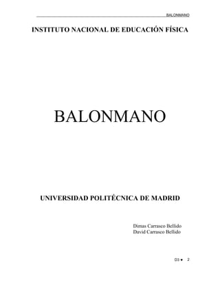 Este documento presenta la terminología y técnicas básicas del balonmano. Se definen los términos clave y se describen los desplazamientos, paradas, sistemas de juego ofensivos y defensivos, y elementos técnicos individuales como pases y lanzamientos. El objetivo es proporcionar una guía básica de la teoría y la práctica del balonmano.