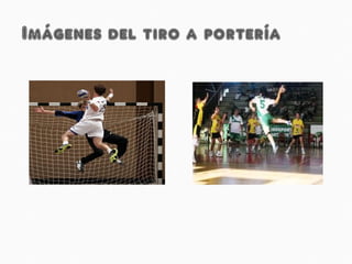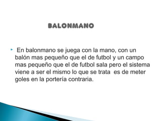 Este documento resume las reglas básicas del balonmano. Se juega con un balón más pequeño que el de fútbol en una cancha más pequeña que la de fútbol sala, con el objetivo de anotar goles. No se pueden dar más de tres pasos sin botar el balón y es falta pisar el área con el balón en la mano. Los equipos consisten en 7 jugadores y 7 suplentes.