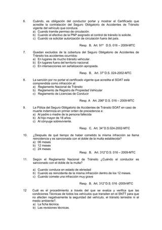 Este documento presenta 36 preguntas y respuestas sobre normas de tránsito y el Seguro Obligatorio de Accidentes de Tránsito (SOAT) en Perú. Las preguntas cubren temas como la cobertura del SOAT, infracciones de tránsito y sus sanciones, normas sobre señalización, preferencia vial, y más. El documento forma parte de un banco de preguntas para postulantes a obtener una licencia de conducir en Perú.