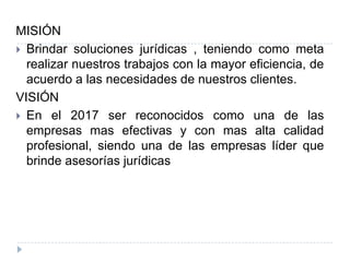 La empresa busca brindar soluciones jurídicas eficientes a clientes de bajos recursos a través de una plataforma virtual. Su misión es ofrecer servicios jurídicos de alta calidad y su visión es ser líder en asesoría jurídica. Para satisfacer las necesidades de sus clientes, la empresa ofrece celeridad, servicios virtuales y asesorías económicas con varios puntos de vista.