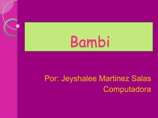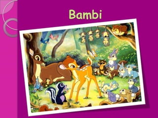 Bambi es un cervatillo que nace en el bosque y es presentado a los demás animales. Su padre le enseña sobre los peligros de los cazadores. Más adelante, Bambi se enamora de una cervatilla llamada Farina. Un día, los perros de los cazadores los persiguen y Bambi resulta herido, pero su padre y amigos lo ayudan a cruzar el río para escapar. Bambi se recupera y más tarde se casa con Farina, teniendo su propio cervatillo.