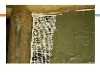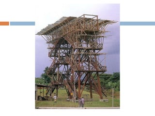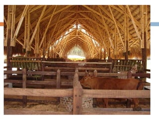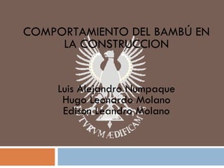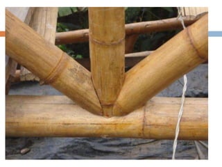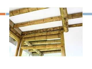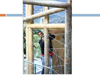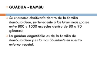 El documento describe las propiedades y usos del bambú, especialmente de la guadua, en la construcción. Explica que la guadua pertenece a la familia de las gramíneas y es muy abundante en Colombia. Describe las partes de la guadua y los tipos más utilizados en construcción, incluyendo guadua macana, guadua cebolla y guadua castilla. También discute las ventajas del bambú como material de construcción debido a su ligereza y resistencia, pero también sus desventajas como su susceptibilidad a la