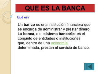 El documento habla sobre la banca y las finanzas. Explica que un banco es una institución financiera que presta y administra dinero. Luego resume brevemente la historia de la banca, mencionando que el primer banco moderno fue fundado en Italia en 1406. Finalmente, describe algunas operaciones bancarias típicas como depósitos en cuentas corrientes, de ahorro y plazo fijo, así como préstamos e inversiones que realizan los bancos.