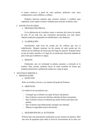 Este documento proporciona instrucciones para hacer pulseras. Explica los materiales necesarios como cuerda, embellecedores y abalorios y cómo conseguirlos. Detalla los pasos para hacer una pulsera, incluyendo cortar la cuerda, colocar el embellecedor y abalorios, y hacer nudos. El objetivo es enseñar a los estudiantes a hacer pulseras y conocer los diferentes materiales y métodos.