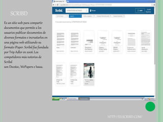 El documento describe varios sitios web para compartir documentos y realizar búsquedas de información, como Scribd para publicar documentos en diferentes formatos, Buenas Tareas que ofrece acceso gratuito a una biblioteca en línea organizada por temas, Taringa donde los usuarios comparten todo tipo de información a través de mensajes, El Rincón del Vago que aloja trabajos donados por usuarios, y SlideShare para subir y compartir presentaciones.