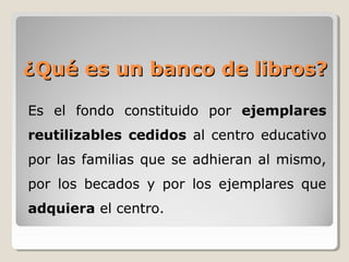 Este documento describe el banco de libros del CEIP Salvador Minguijón. Explica que el banco de libros está constituido por libros cedidos por las familias, becados y el centro para ser reutilizados. Detalla la comisión que supervisa el banco, compuesta por la secretaria, representantes de padres y profesores. Además, especifica el proceso de participación de las familias, que incluye adherirse voluntariamente y aportar libros en buen estado o 20€, así como las obligaciones de las familias respecto al uso