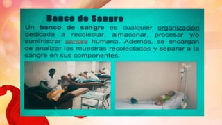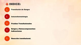 Este documento resume los principales aspectos de la transfusión de sangre y hemoterapia. Explica que la transfusión de sangre implica la transferencia de sangre o componentes sanguíneos de un donante a un receptor. También describe las pruebas transfusionales estándar, los componentes sanguíneos y sus indicaciones, así como las posibles reacciones transfusionales inmediatas o tardías. El objetivo es proporcionar una transfusión segura y eficaz.