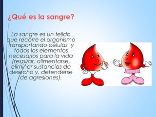 Este documento describe los beneficios de donar sangre de forma voluntaria. Explica que la sangre es un tejido vital que transporta oxígeno y nutrientes por el cuerpo, y que solo se puede obtener a través de donaciones voluntarias. Al donar sangre se salvan vidas de personas que sufren accidentes, enfermedades o necesitan transfusiones. Tanto hombres como mujeres sanos entre 18 y 55 años pueden donar sangre cada tres o cuatro meses para ayudar a quienes lo necesitan.