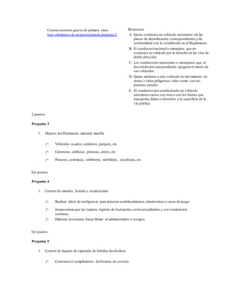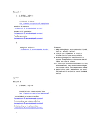 El documento presenta una serie de preguntas y respuestas sobre temas relacionados con la labor policial. Aborda conceptos como recolección de indicios, inteligencia electrónica, contravenciones de tránsito, control de establecimientos, procedimientos operativos normales, tipos de materiales como el papel, textil y lítico, entre otros.