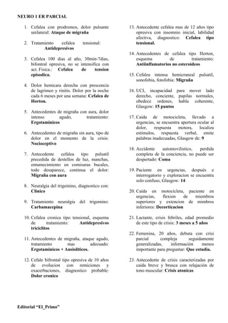 Este documento presenta 64 preguntas relacionadas con temas de neurología como cefaleas, crisis epilépticas, síndromes y trastornos neurológicos. Las preguntas abarcan desde síntomas y diagnósticos de diferentes patologías hasta esquemas terapéuticos. El documento parece ser un examen parcial de neurología con el objetivo de evaluar conocimientos clínicos en esta área.