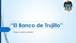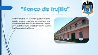 El documento describe el Banco de Trujillo, el primer banco fundado en 1871 en la ciudad de Trujillo, Perú. El banco operó inicialmente en parte de la casa del ciudadano inglés Eugenio Loyer. Se enumeran a los accionistas Vicente Rosell, Fernando Ganoza, Felipe Nery y Eugenio Loyer. Finalmente, se muestran imágenes y denominaciones de los billetes emitidos por el Banco de Trujillo, que incluyen de 10 centavos, 20 centavos, 50 centavos, 1 sol, 5 soles, 50 soles y 100