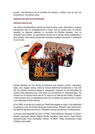 El ska se originó en Jamaica en la década de 1950 y luego se expandió a nivel mundial. Ecuador tiene varias bandas de ska que fusionan este género con ritmos locales como la cumbia. Las principales bandas de ska ecuatoriano son Rocola Bacalao, La Piñata y Chulpi Tostado, las cuales mezclan ska con otros estilos latinos y han tenido éxito tanto en Ecuador como en el extranjero.