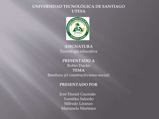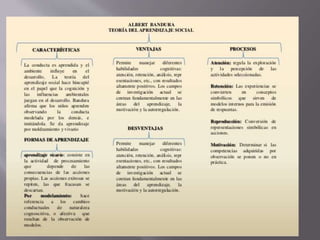 Este documento presenta información sobre Albert Bandura, un psicólogo y pedagogo canadiense conocido por su teoría del aprendizaje social. Bandura se opuso a las ideas de que la agresión es patológica o causada por la frustración, y en cambio argumentó que el aprendizaje a través de la imitación y observación de modelos es lo que determina si las personas imitan o no. Sus investigaciones sentaron las bases para el estudio posterior del impacto de los modelos sociales del hogar, la televisión y los grupos de amigos.