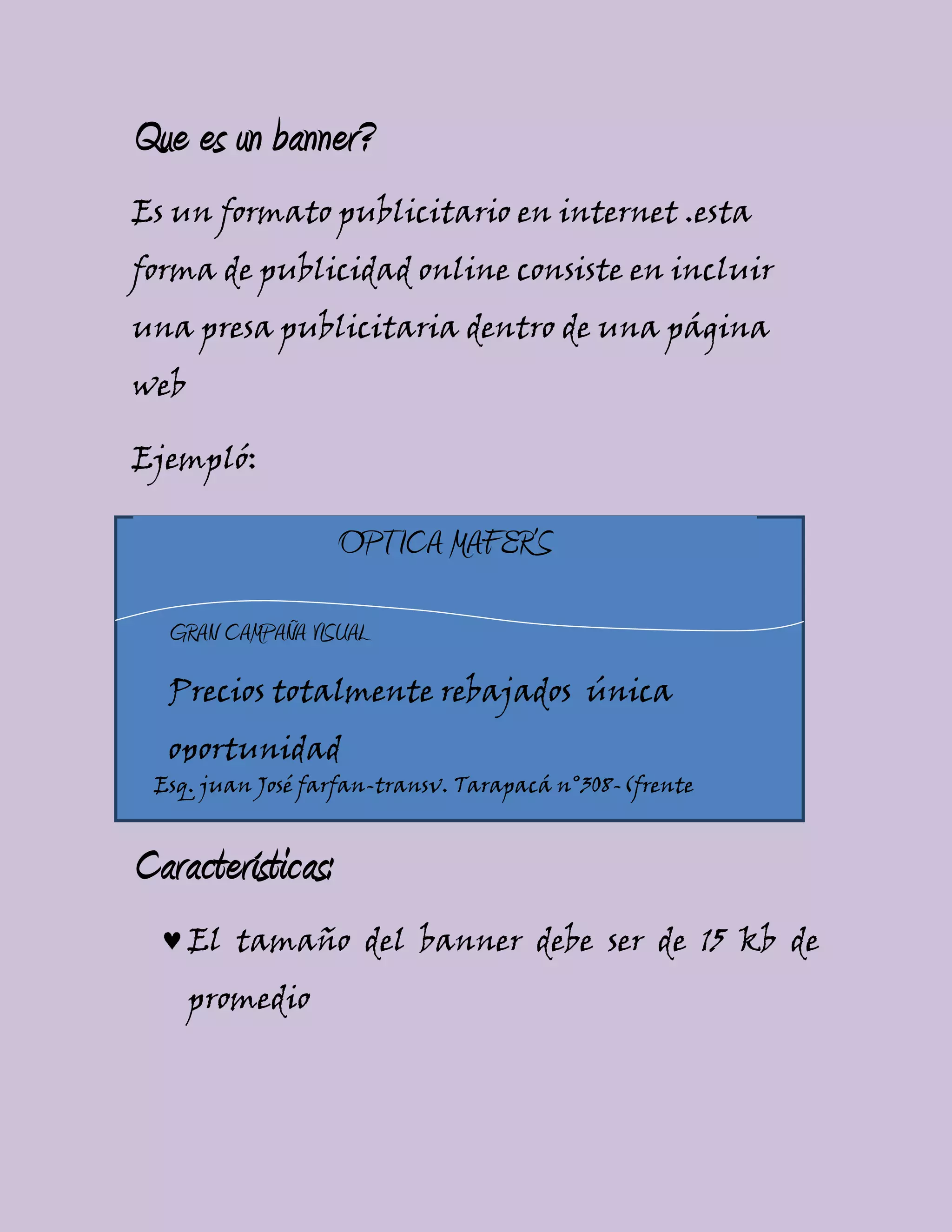 Un banner es un formato publicitario en internet que consiste en incluir una pieza publicitaria dentro de una página web. Debe tener un tamaño promedio de 15 kb, evitar saturaciones de imágenes, colores y textos, e incluir el logotipo o dirección web para identificar la marca. Los banners animados y que incluyen llamadas a la acción como "click aquí" tienen más posibilidades de éxito.