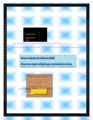 Este documento describe los diferentes tipos de banners, incluyendo animados, estáticos, simples y complejos. También proporciona algunos ejemplos de banners y sitios web populares para crear banners, así como las condiciones de derechos de autor que deben seguirse.