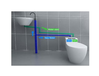 El documento habla sobre la historia y evolución de los baños y sus componentes principales como el inodoro, el bidet y el cuarto de baño. Explica que los primeros baños datan de 8000 a.C. en Escocia y que el moderno inodoro de una pieza fue patentado en 1871, permitiendo que el baño se incorporara a las viviendas. También describe esquemas funcionales y básicos de baños, así como conceptos relacionados con la ergonomía, las aguas grises y la recolección de agua. Finalmente