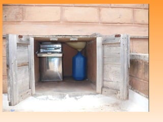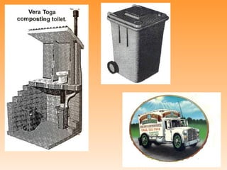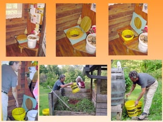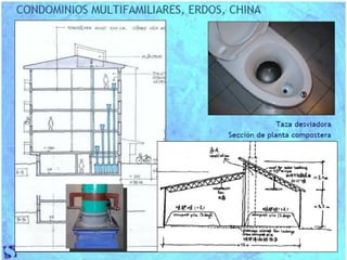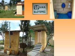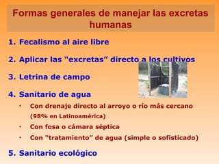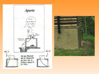 Este documento describe diferentes opciones para el manejo de excretas humanas, incluyendo el fecalismo al aire libre, aplicarlas directamente a cultivos, letrinas de campo, sanitarios de agua y sanitarios ecológicos. Explica que los sanitarios ecológicos no usan agua, no contaminan el agua, no requieren energía y aprovechan los nutrientes en las excretas para fertilizar el suelo. Describe varios tipos de sanitarios ecológicos como de doble cámara, de tambo y de cub