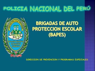 Este documento describe las Brigadas de Autoprotección Escolar (BAPE), que son organizaciones formadas por la comunidad educativa, la población y la policía nacional con el objetivo de realizar acciones coordinadas de seguridad integral en las instituciones educativas. El documento explica el proceso de formación de las BAPE, incluyendo fases de sensibilización, organización, capacitación, consolidación y supervisión. También describe los roles de la comunidad educativa, la policía nacional y la sociedad organizada en el trabajo de las BAPE.