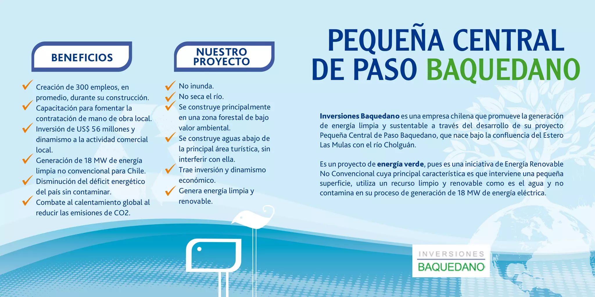 El proyecto Pequeña Central de Paso Baquedano propone construir una central hidroeléctrica en Chile que generará 18 MW de energía limpia y renovará a través del uso del agua como recurso. El proyecto creará 300 empleos, invertirá $56 millones, y operará con un caudal ecológico de 1,500 litros por segundo para proteger el medio ambiente.