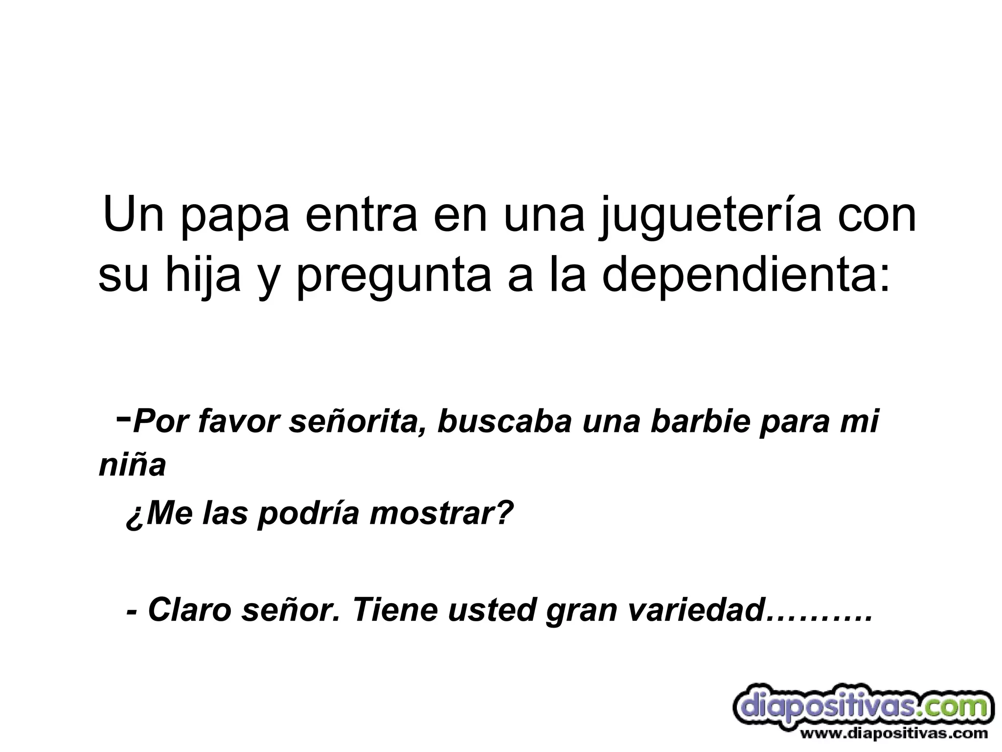 Un padre visita una juguetería con su hija para comprar una Barbie. La dependienta muestra varias Barbies a 19,95€ cada una excepto la Barbie divorciada, que cuesta 500€. Cuando el padre pregunta por qué cuesta más, la dependienta explica que la Barbie divorciada incluye todos los bienes de Ken después del divorcio, incluyendo su casa, vehículos y yate.